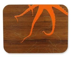 Designer Joe Futschik, with a desire to learn new method of creation, has studied the process of silkscreening an presents, through jefdesigns, a new series of marin images. Each piece is hand printed on wood by the designe in a signed, limited edition of 60 prints per image. Jo further explores his interest in marine life, combinin trademark elements of warm woods and unique colo combinations with the (new to him) process o screenprinting, The result is an interesting variation of th modern, graphic imagery that jefdesigns is known for