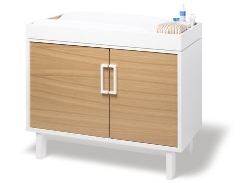 Notes: Concealed compartment for Diaper Genie™. Lots of storage. A flip of the top makes the transition into the adult world. Light oak and white lacquer. Shown with optional accessories. Diaper Genie™ not included. Imported. Ships assembled with exception of the legs and door/drawer pulls. Imported.